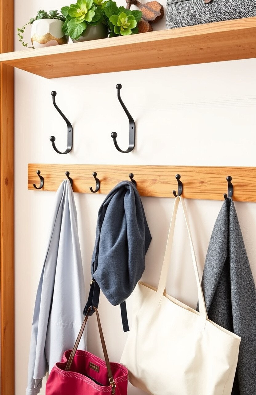 Wooden coat racks are warm and inviting. Metal hooks add an industrial touch.