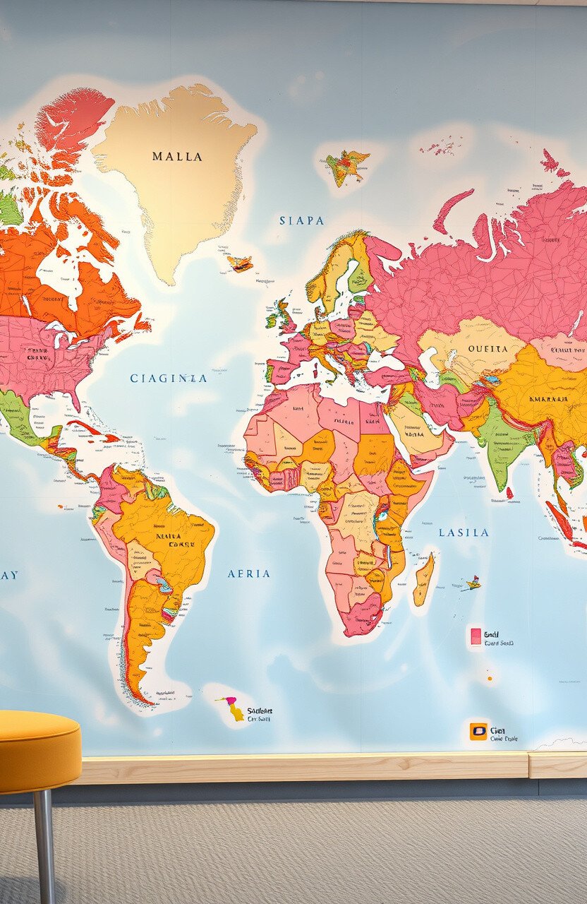 Create a world map wall with interactive elements. It’s a gateway to global exploration and learning.