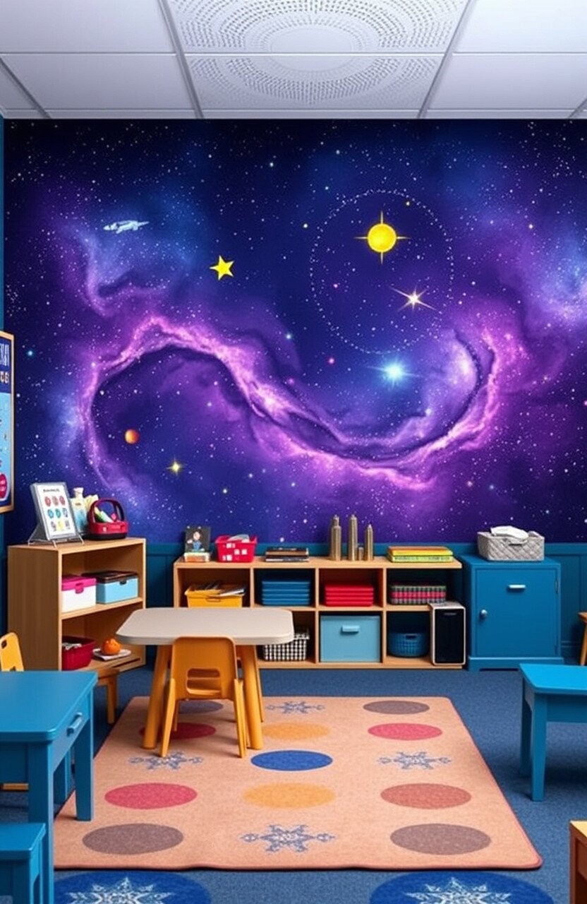 Take a journey to the stars with an outer space-themed classroom. Use dark colors and star motifs for a cosmic atmosphere.