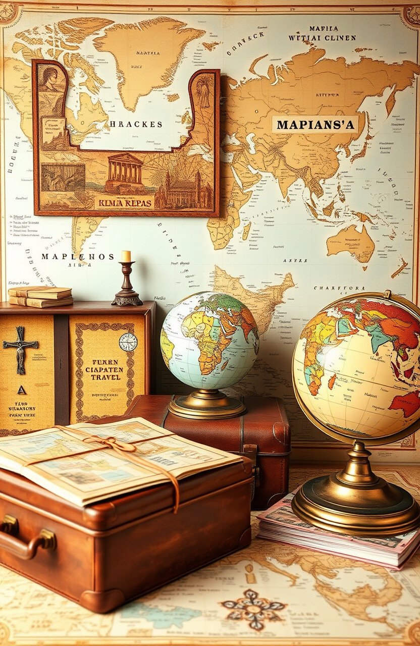 Take students on a journey through time with vintage maps. Use suitcases and globes as decor.
