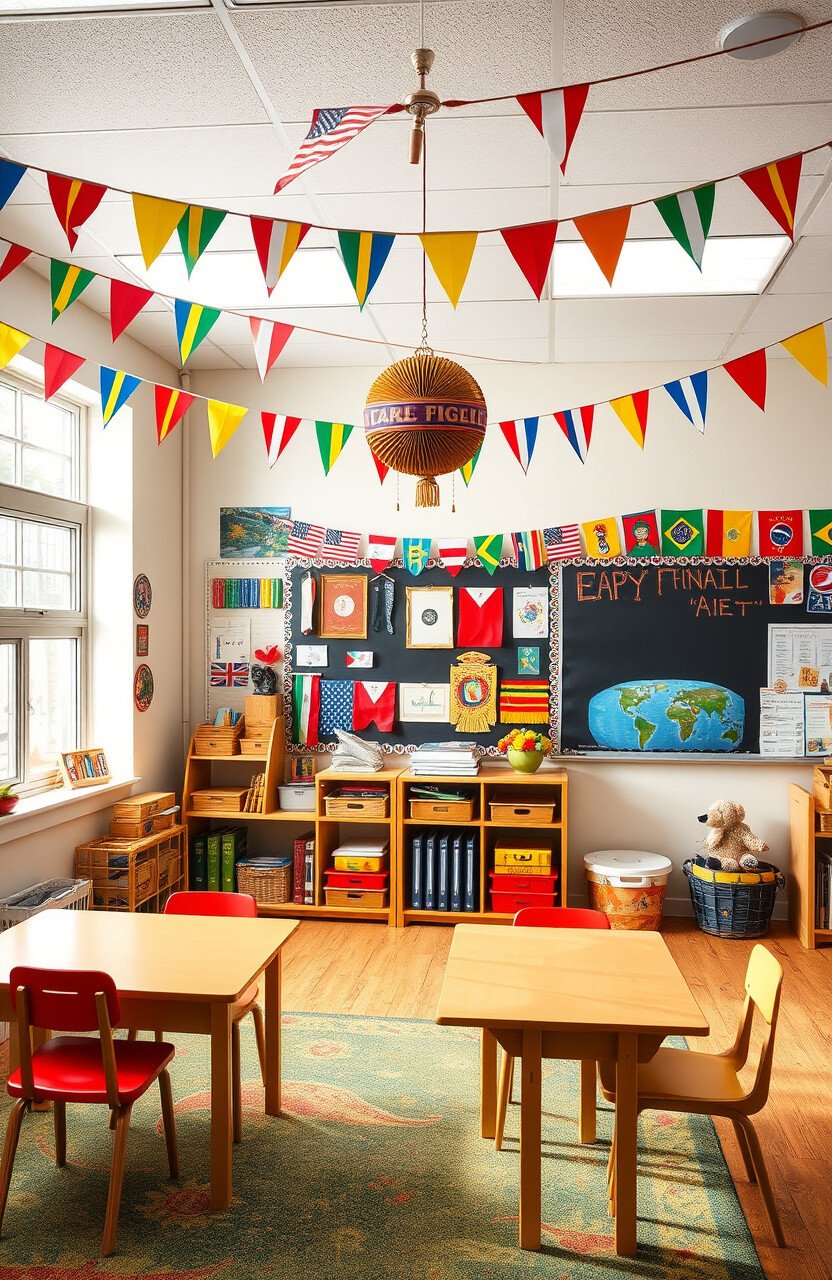 Celebrate diversity with a cultural-themed classroom. Use flags and cultural artifacts for decor.