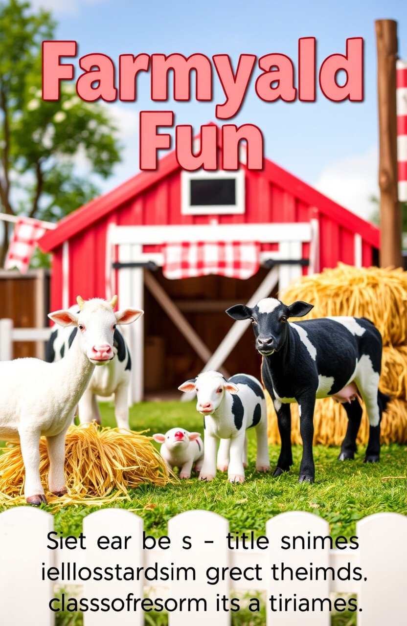 Create a barnyard scene with hay bales and animals. Use red and white checkered patterns for charm.