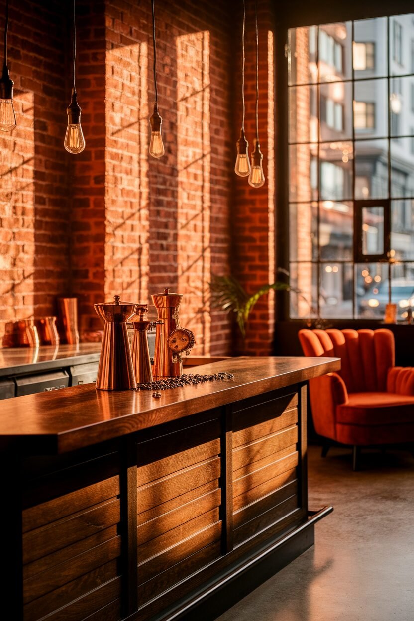Exposed pipes and metal fixtures make the industrial coffee bar stand out. It’s ideal for those who enjoy a raw, edgy aesthetic.