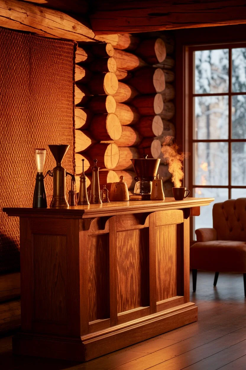 Warm wood tones and soft textiles make the cozy cabin coffee bar inviting and snug. It’s ideal for those who love a rustic retreat.