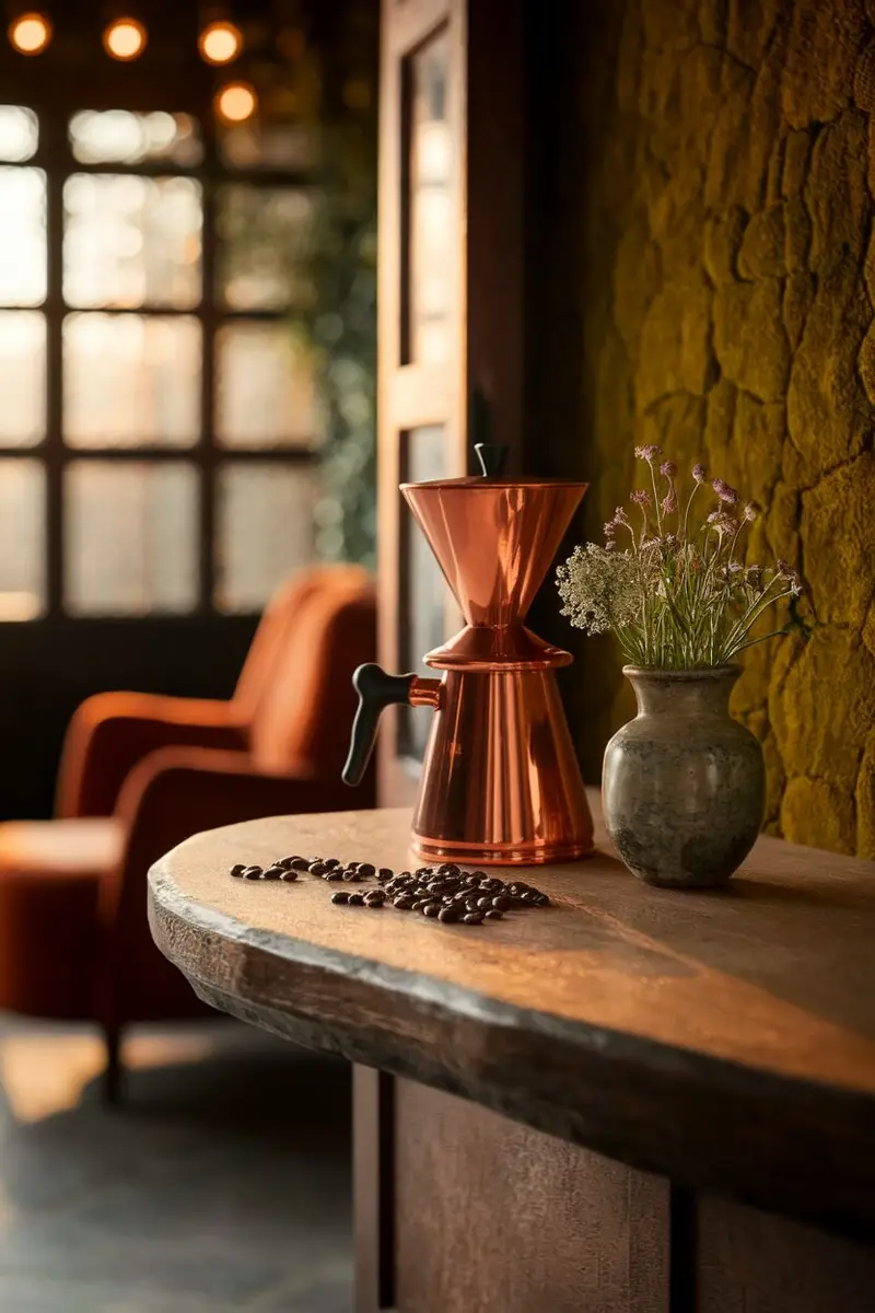 Vibrant plants and earthy tones define the urban jungle coffee bar. It’s ideal for nature lovers who want to bring the outdoors in.