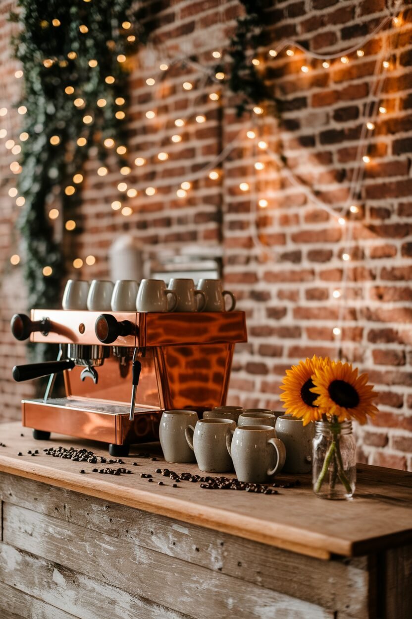 Metallic finishes and raw elements define the industrial chic coffee bar. It’s great for those who enjoy a modern, edgy aesthetic.