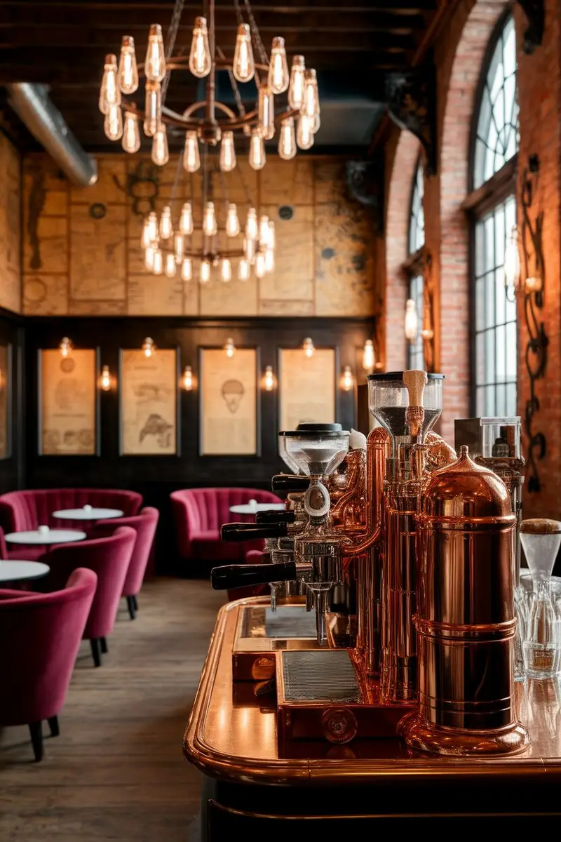 Gears and vintage machinery define the steampunk coffee bar. It’s ideal for those who love a touch of fantasy and adventure.