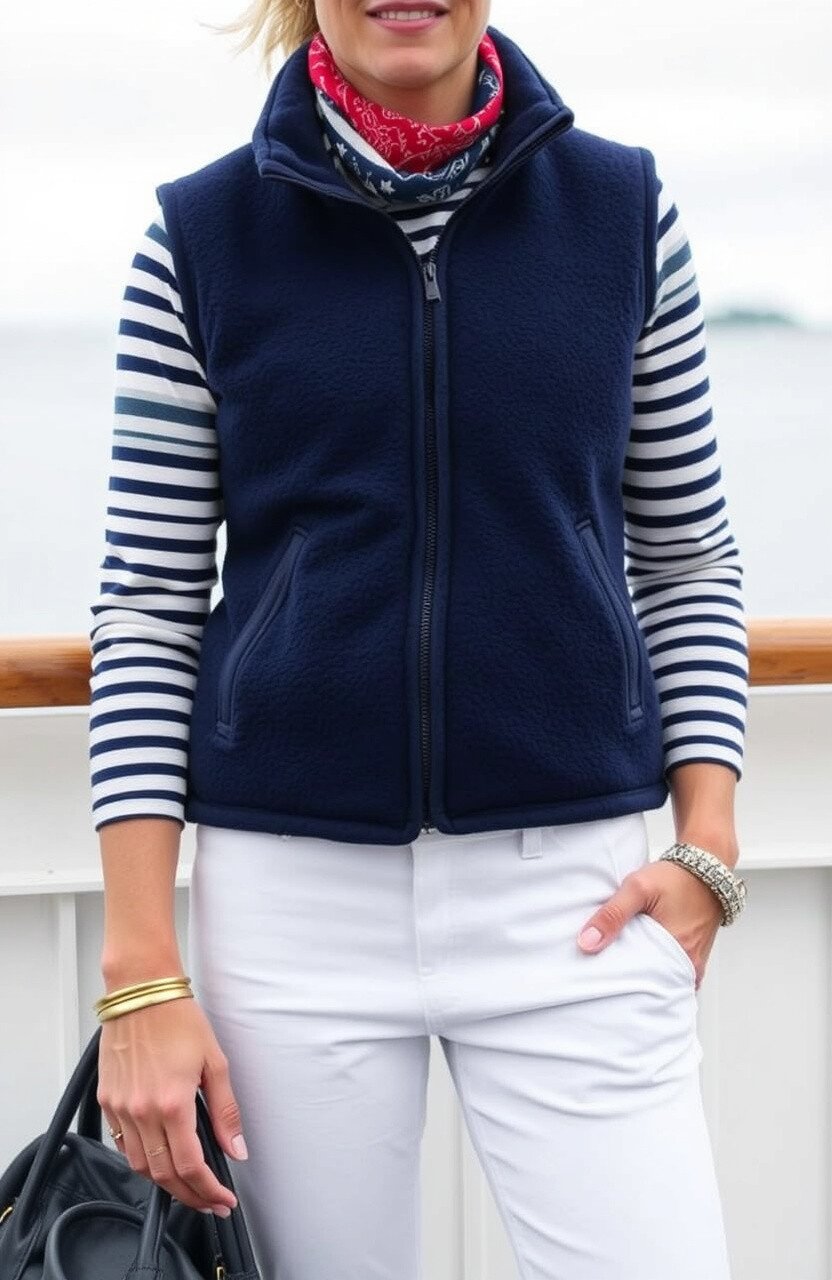 Choose a navy fleece vest and team it up with a striped Breton shirt. Finish with white jeans for a crisp, clean look.