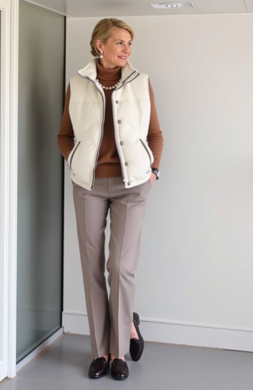 Opt for a cream-colored fleece vest. Pair it with a cashmere sweater and tailored trousers for a classy look.
