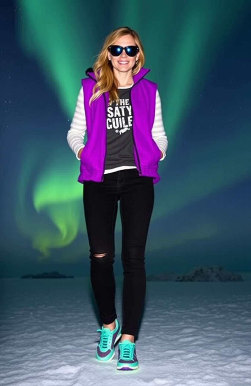 Capture the magic of the auroras with a purple fleece vest. Pair it with a graphic tee and black jeans.