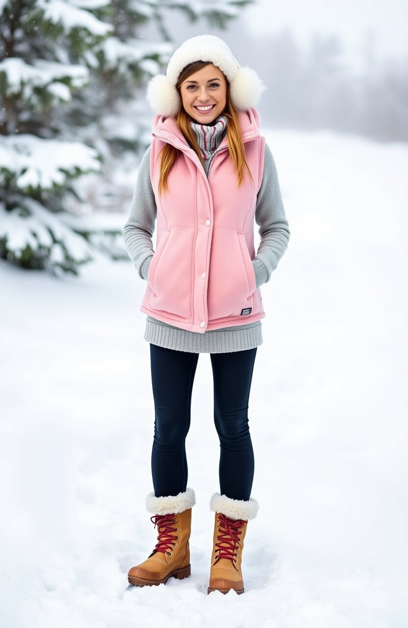 Feel the joy of a snow day with a pastel pink fleece vest. Layer over a cozy hoodie and leggings.