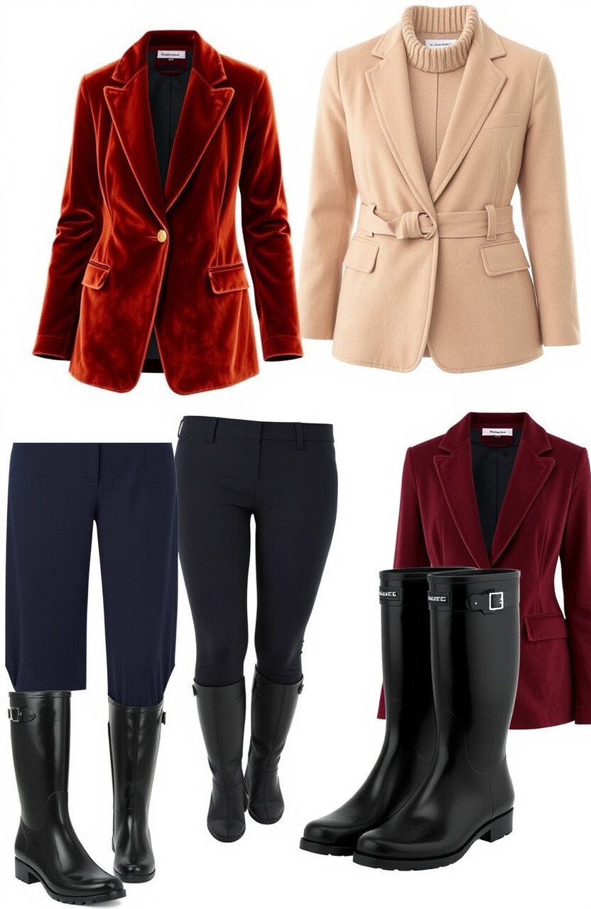 Rain boots with a glossy finish add a modern touch. Velvet blazers are priced around $75, making them a chic and versatile choice for your cruise wardrobe.