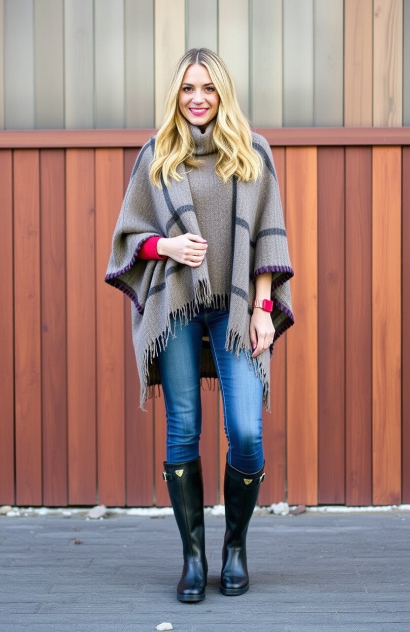 A wool poncho over a simple denim outfit creates a stylish, effortless look. Ponchos are great for layering and can easily be thrown over any outfit for added warmth. Choose a poncho with a pattern or a pop of color.