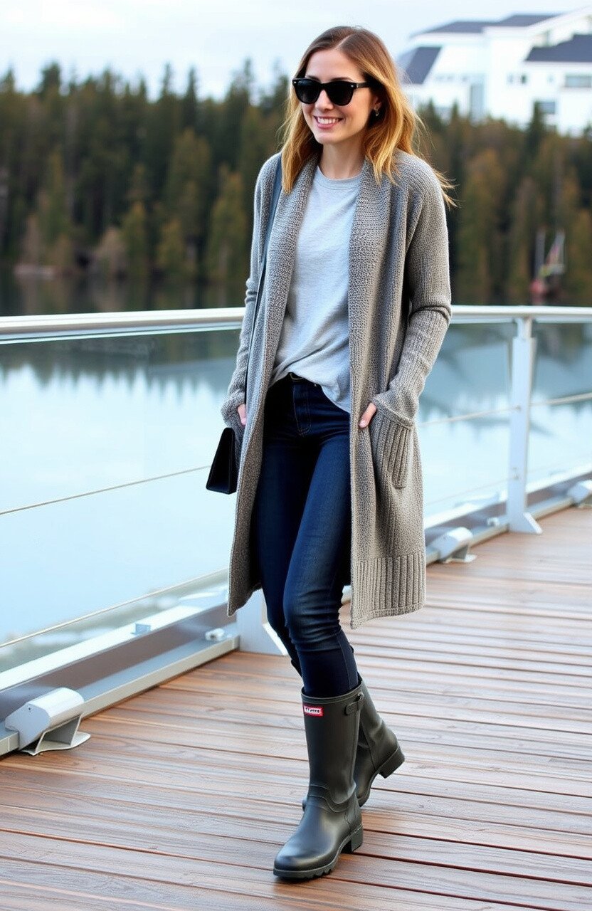 Finish the look with sleek, matte rain boots. This outfit is perfect for casual outings. Longline cardigans are generally priced around $40, making them an affordable addition to your wardrobe.