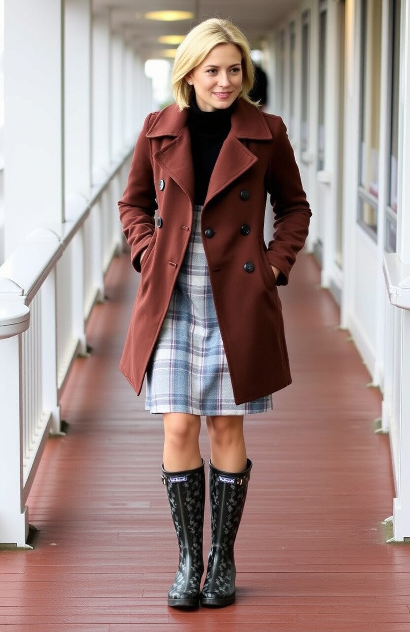 Rain boots with a subtle pattern add a playful touch. Peacoats usually cost around $90, offering style and warmth in one package.