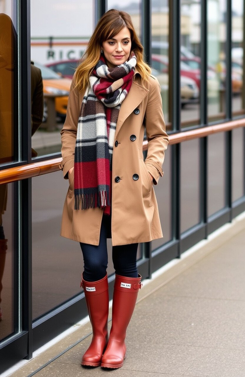 Rain boots in a matching color pull the look together. A trench coat is an investment piece, often priced from $80 to $150. This outfit ensures you’re prepared for any weather in style.