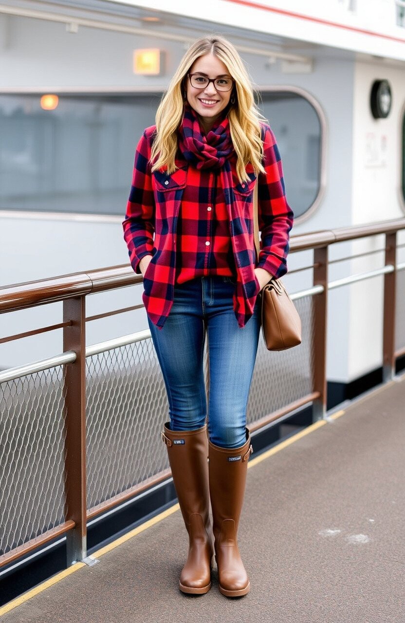 The jeans offer comfort and flexibility for exploring the decks or heading ashore. Pair with ankle-high rain boots in a neutral color. This look is versatile and can be dressed up or down. A flannel shirt can cost around $30, and pairing it with jeans makes for an easy, casual outfit.