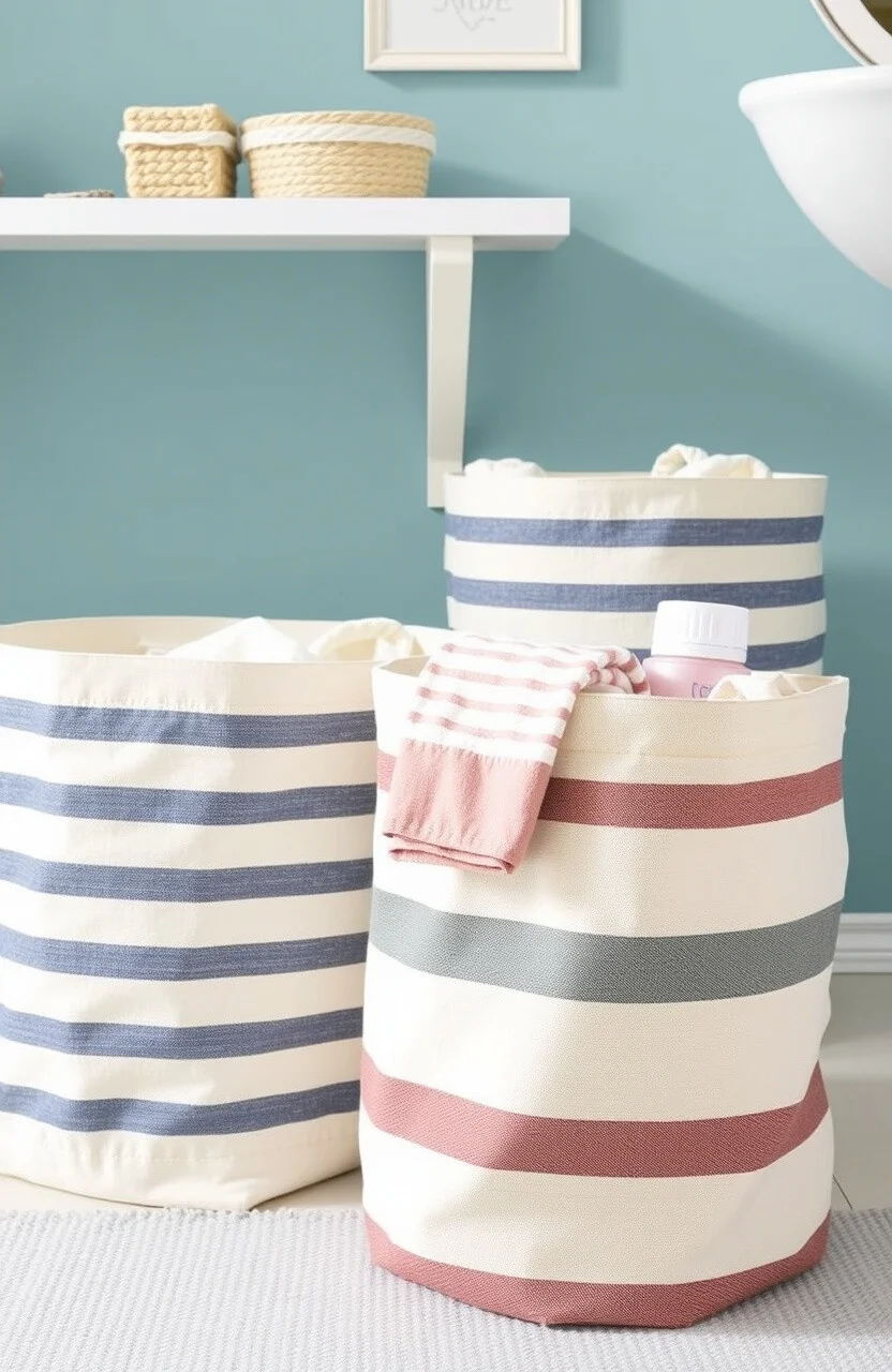 Striped canvas bins offer a classic and timeless look. They work well in bathrooms or laundry rooms, storing towels or toiletries.