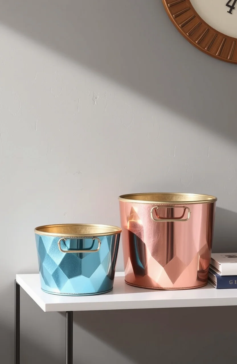 They are great for storing office supplies or magazines, making them both functional and stylish. Metallic finishes reflect light beautifully.