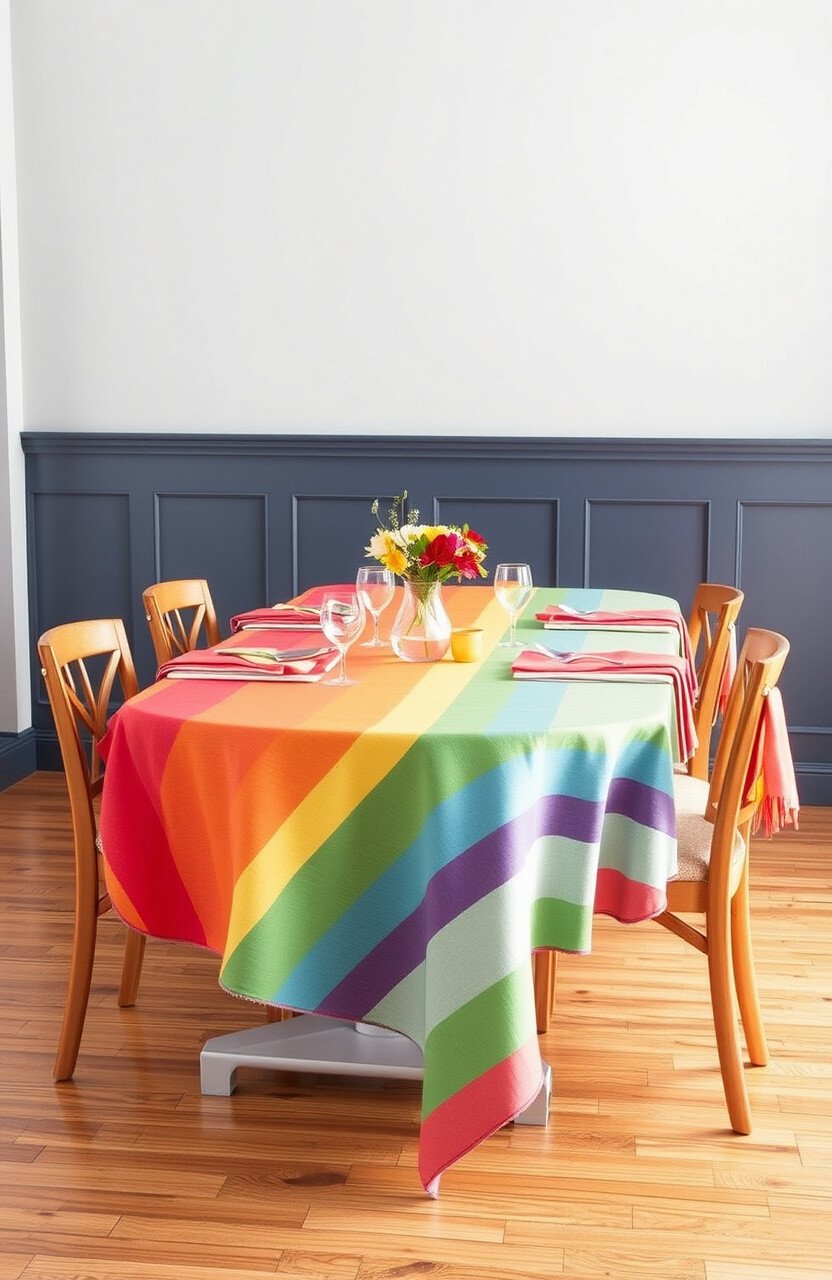 Dress up your dining table with a rainbow tablecloth. It sets the stage for joyful gatherings and mealtime magic.