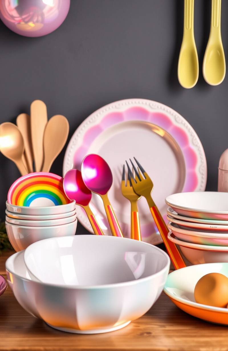 Trending kitchenware includes iridescent and colorful patterns. Many options are available at affordable prices.