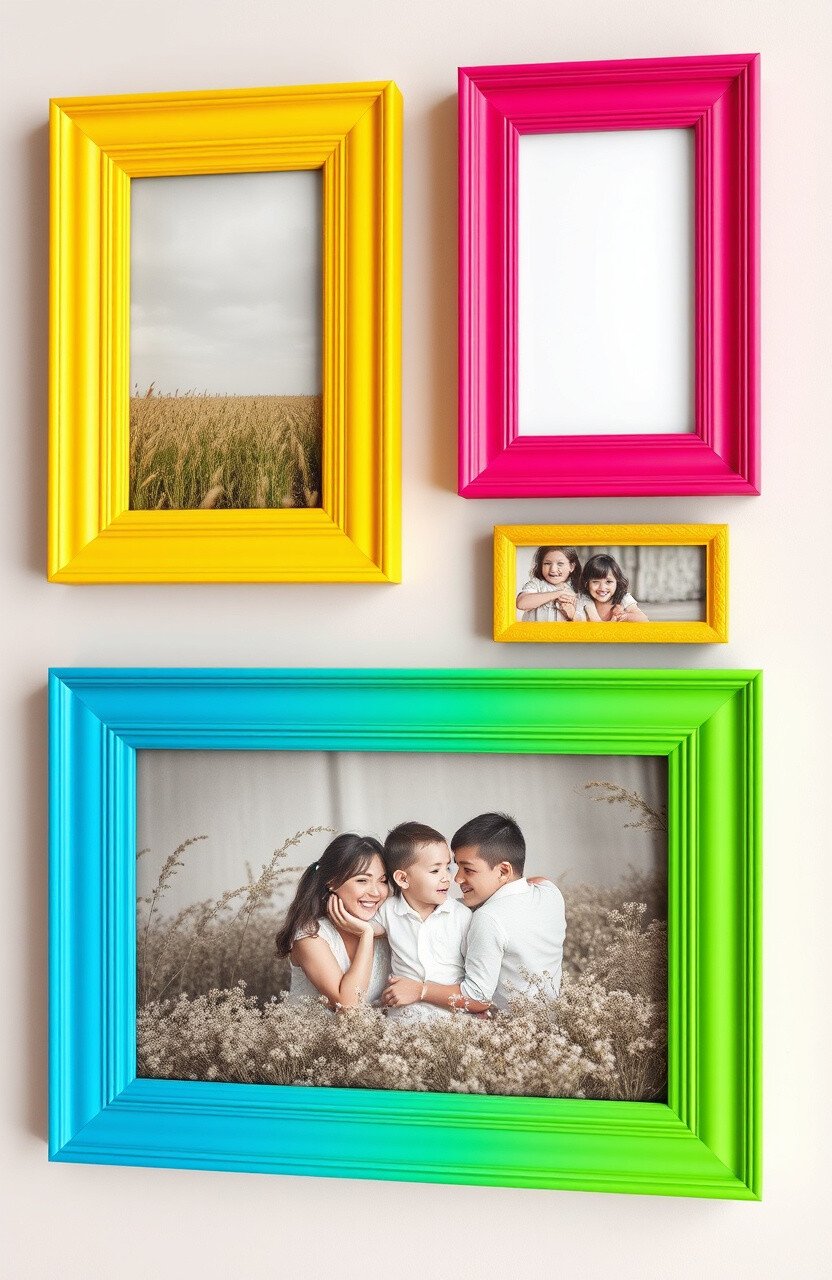 Choose frames in different sizes and shades. It’s a vibrant way to showcase your cherished moments.