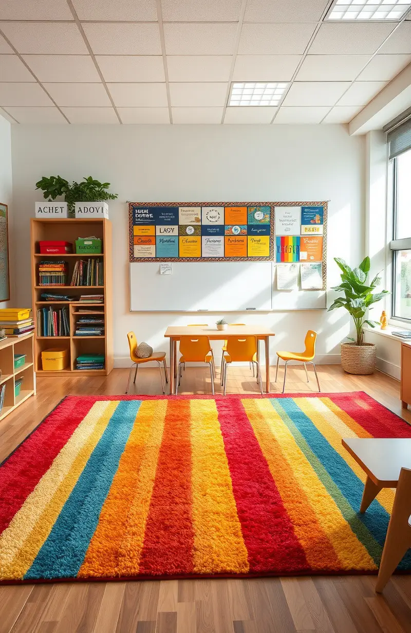 A bright rug can define a space, making it cozy and inviting. Rugs add warmth and color underfoot, perfect for storytime or group activities.