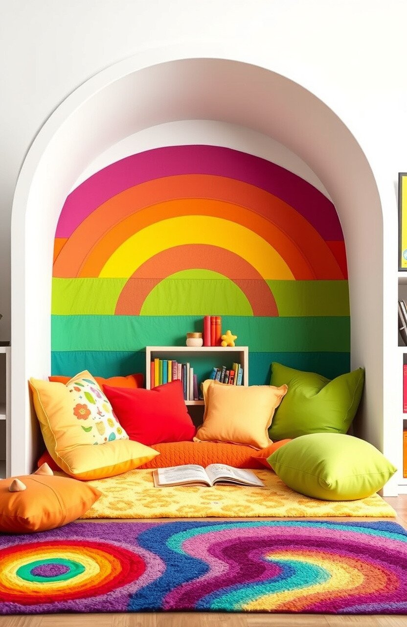 A rainbow reading nook is a cozy spot filled with colorful pillows and rugs, where kids can escape into a world of books. It encourages reading by making it a fun and inviting activity.
