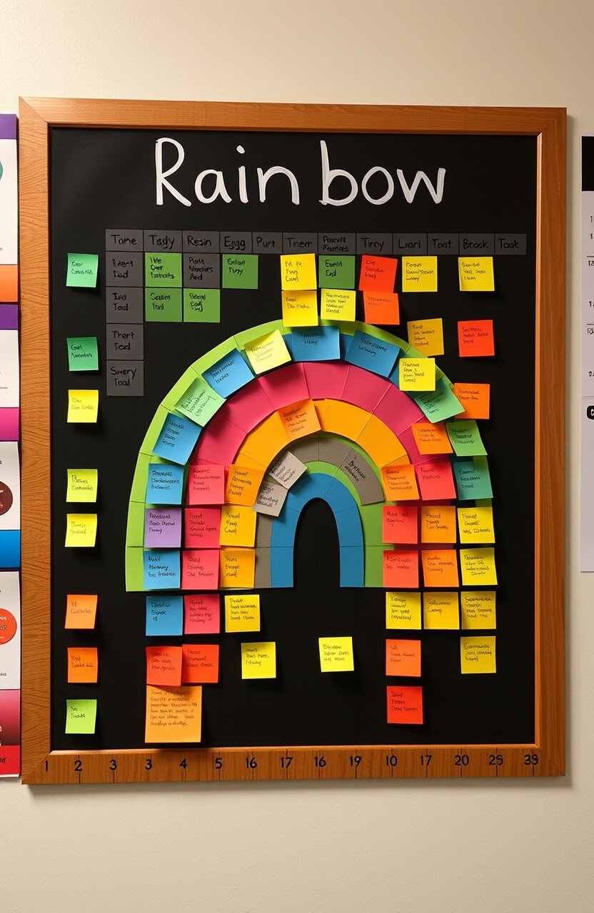 Dedicate a wall to displaying student artwork in a rainbow-themed gallery. It celebrates creativity and individuality.