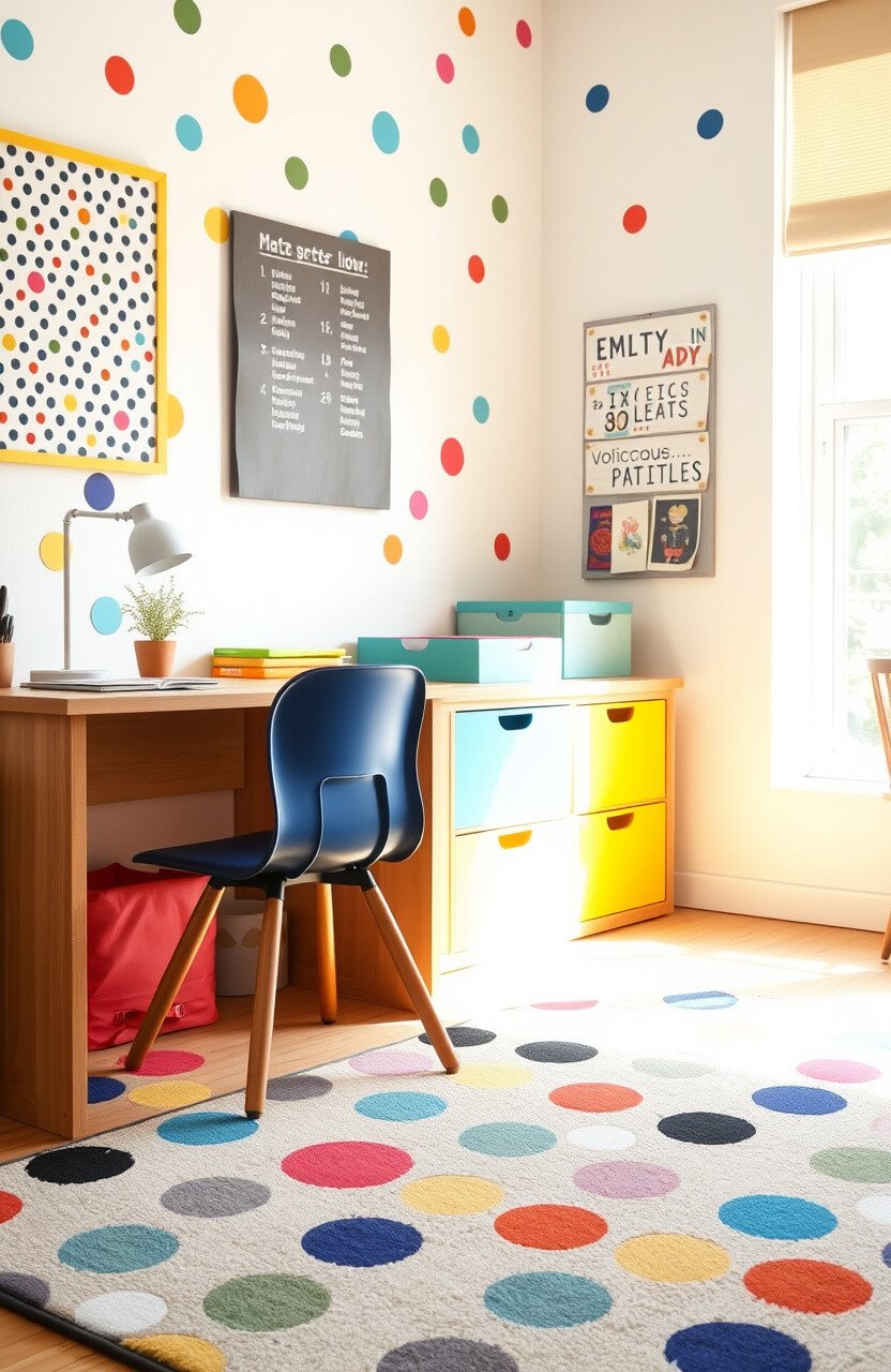 With bold and subtle color choices, they can fit any theme. A dotted rug under a desk is like a sprinkle of happiness.
