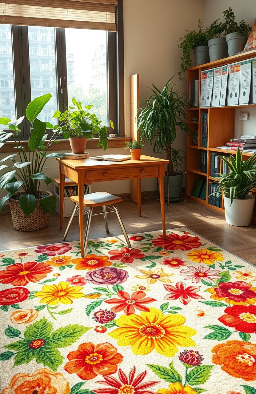 Plant-themed rugs can bring the outdoors inside. They add a touch of nature and tranquility to desks.