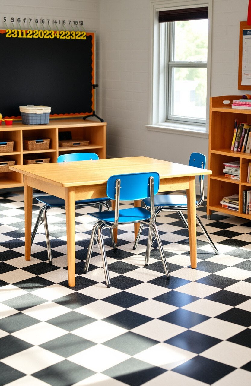 Checkerboard rugs are affordable and widely available. A timeless choice for any classroom.