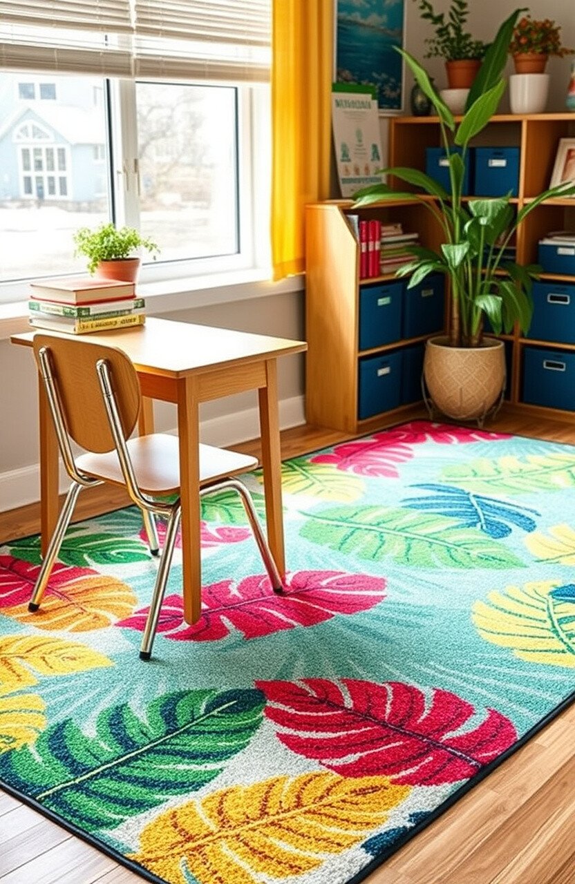 Tropical-themed rugs can bring a taste of paradise indoors. They add a vibrant and cheerful touch to desks.