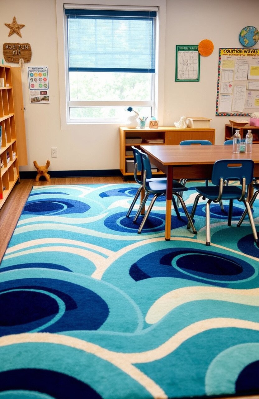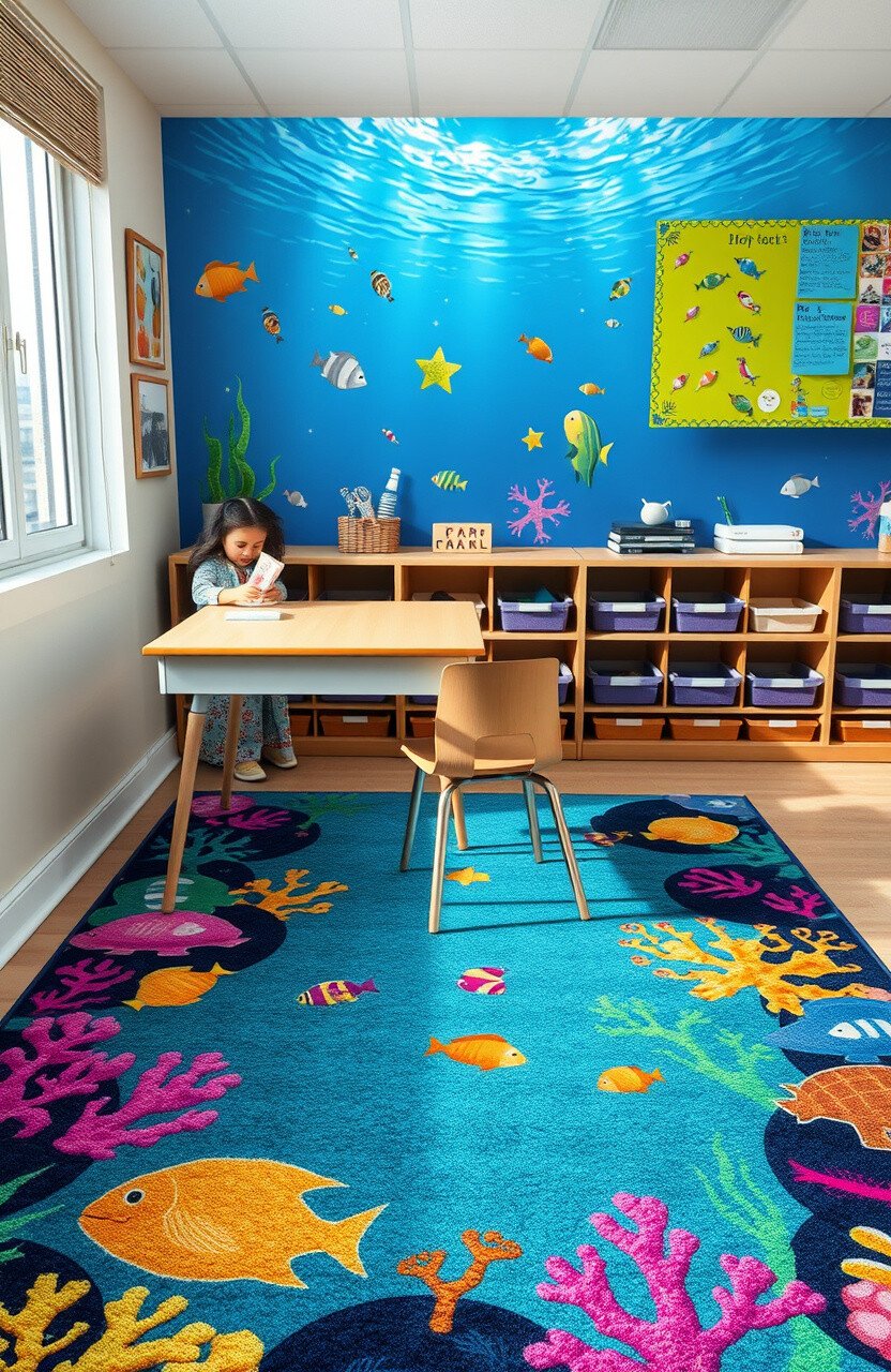 Ocean-themed rugs can transport students to an underwater adventure. They add a calming and serene touch to desks.