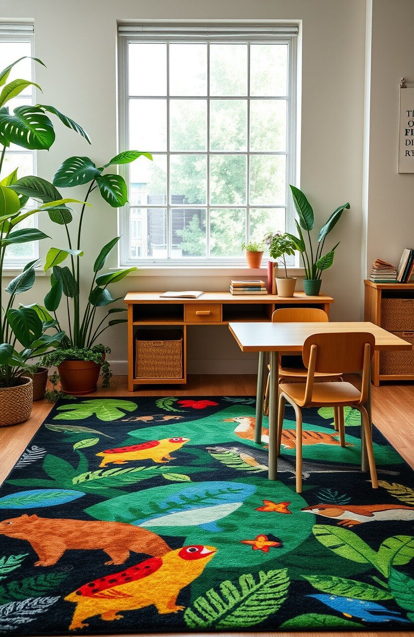 Jungle-themed rugs can take students on a wild adventure. They add a sense of excitement and exploration to desks.