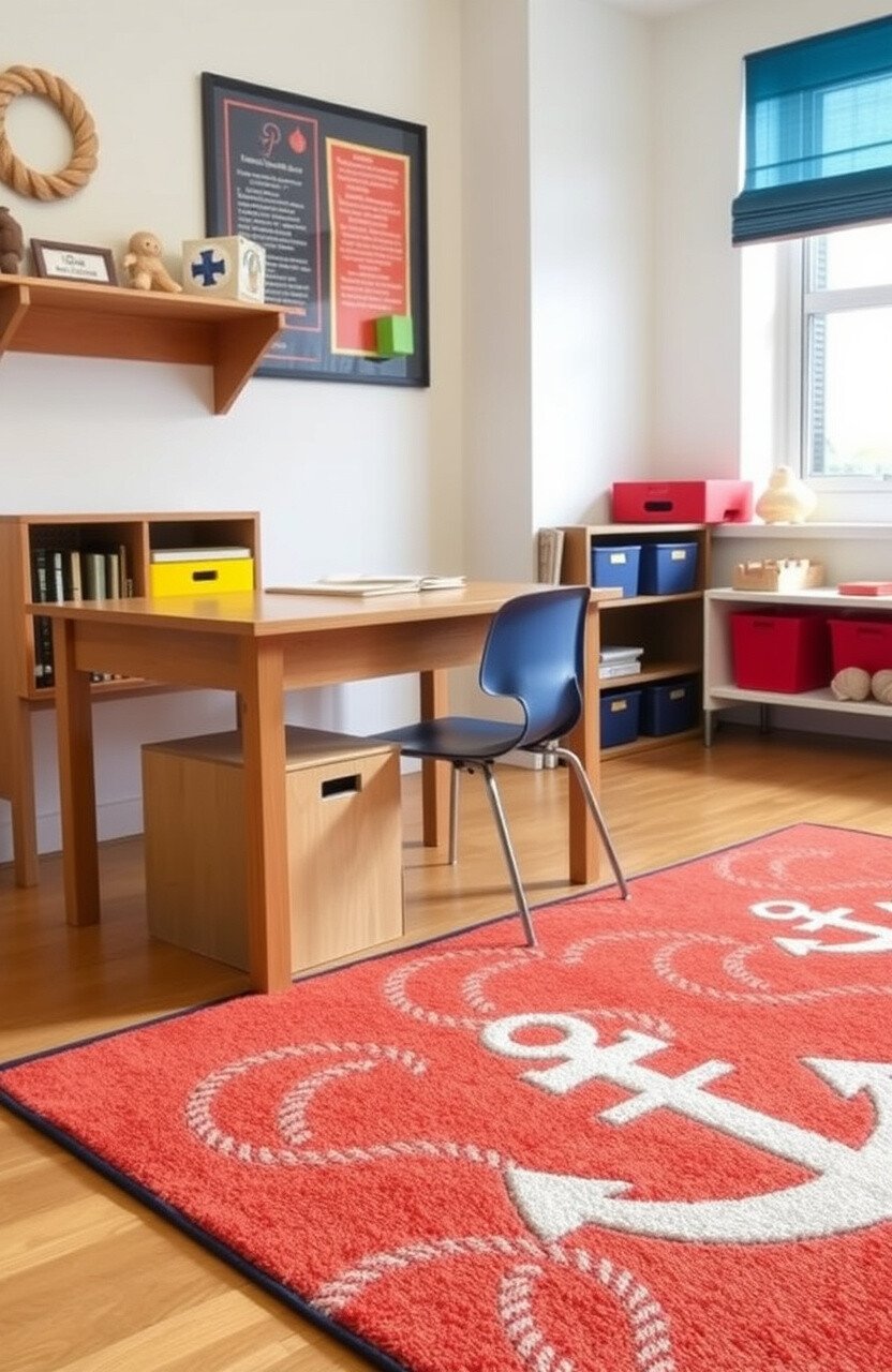Nautical-themed rugs can bring a seaside vibe indoors. They add a sense of adventure and exploration to desks.