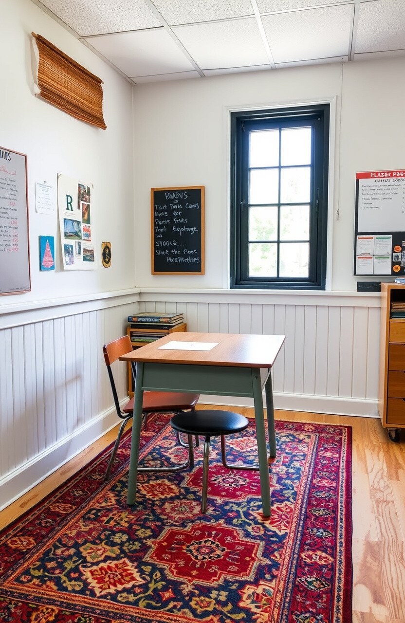 Rustic rugs can add warmth and texture to a classroom. They bring a cozy and inviting feel to desks.