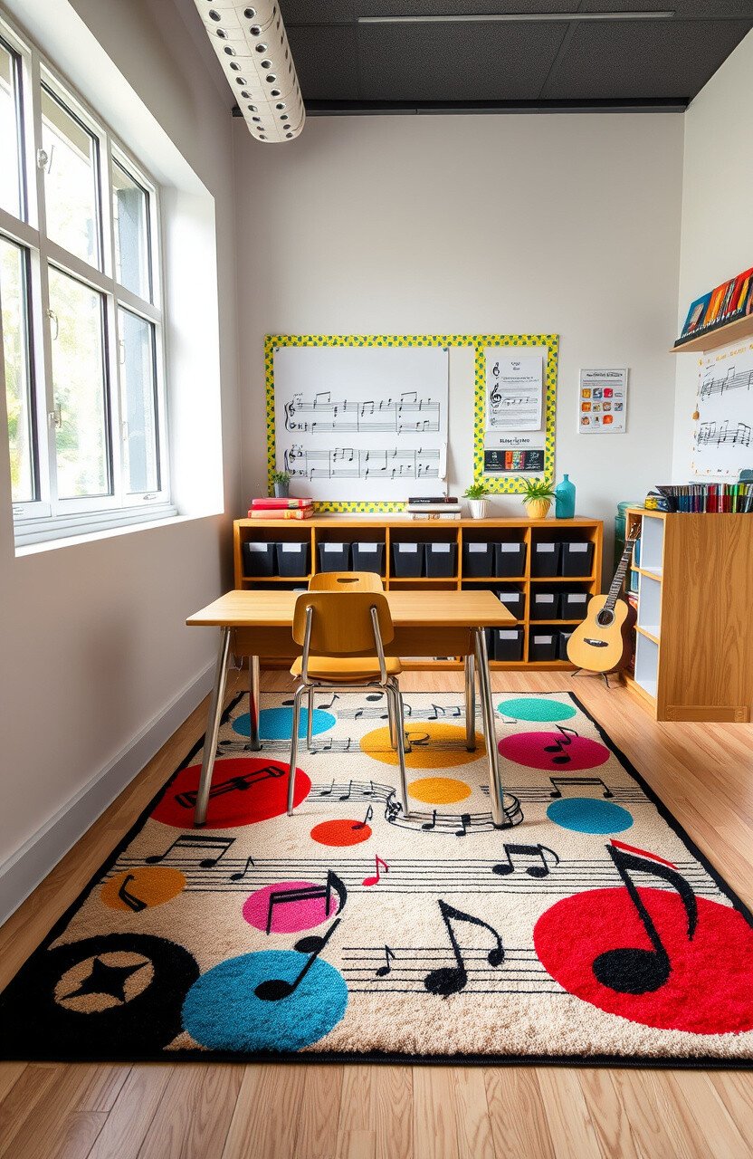 Music-themed rugs can strike the right chord in any classroom. They add a melodious and harmonious touch to desks.