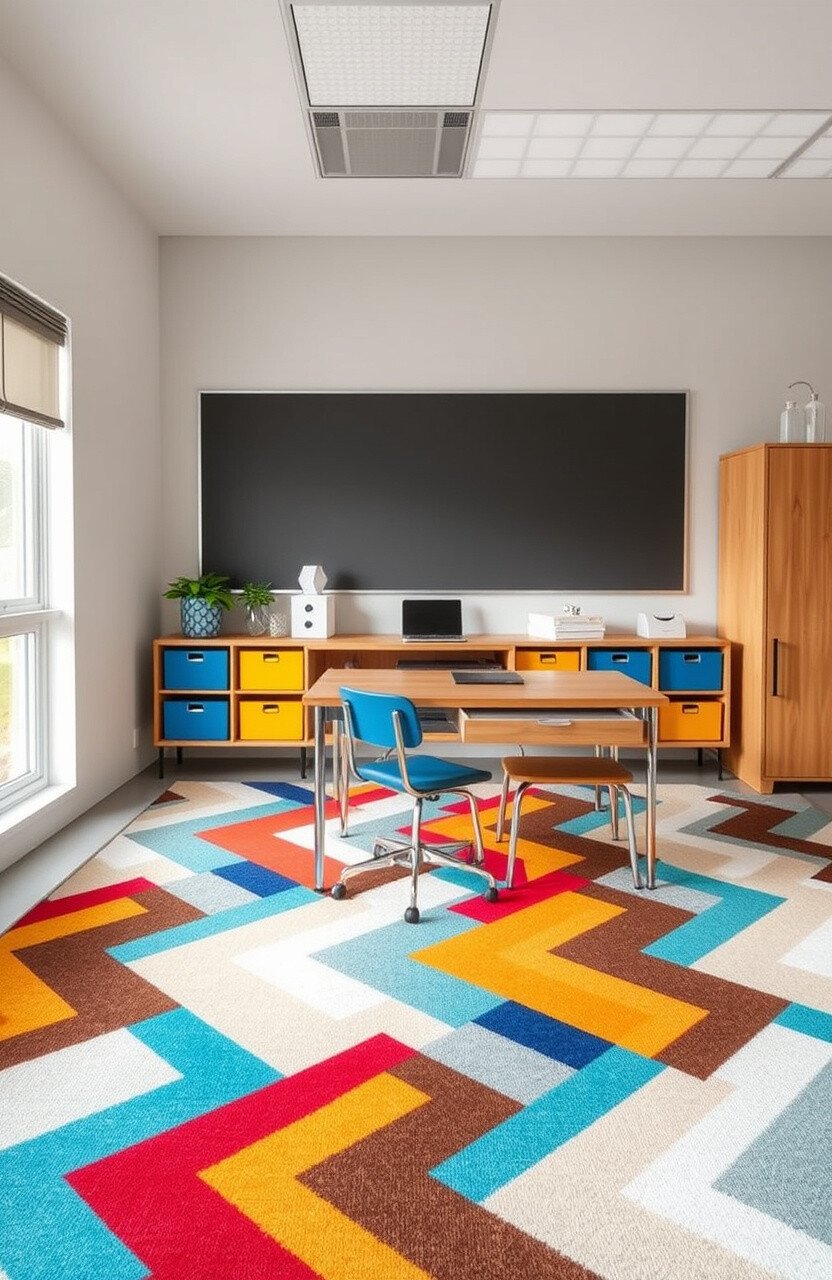 Chevron rugs are widely available and cost-effective. A chic choice for modern classrooms.