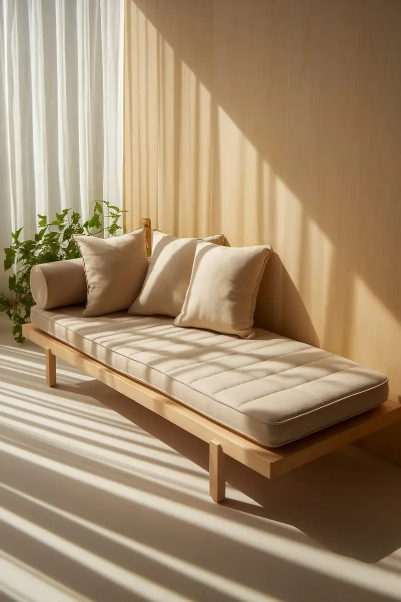 A minimalist daybed brings serene vibes with its clean lines and neutral colors. Think light wood, soft white linens, and a splash of greenery for a fresh touch.