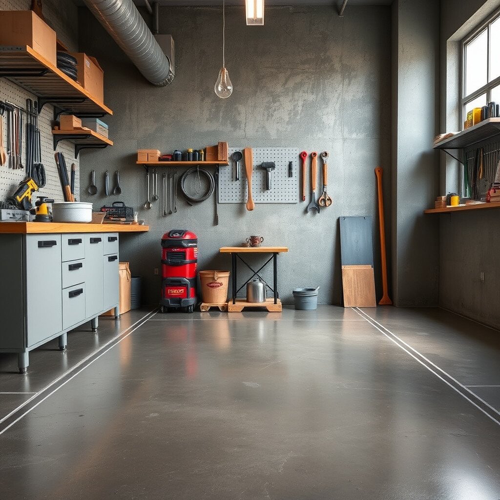 Upgrade your workshop with a stylish concrete floor paint job. Neutral tones like taupe or charcoal can create a professional, organized feel.