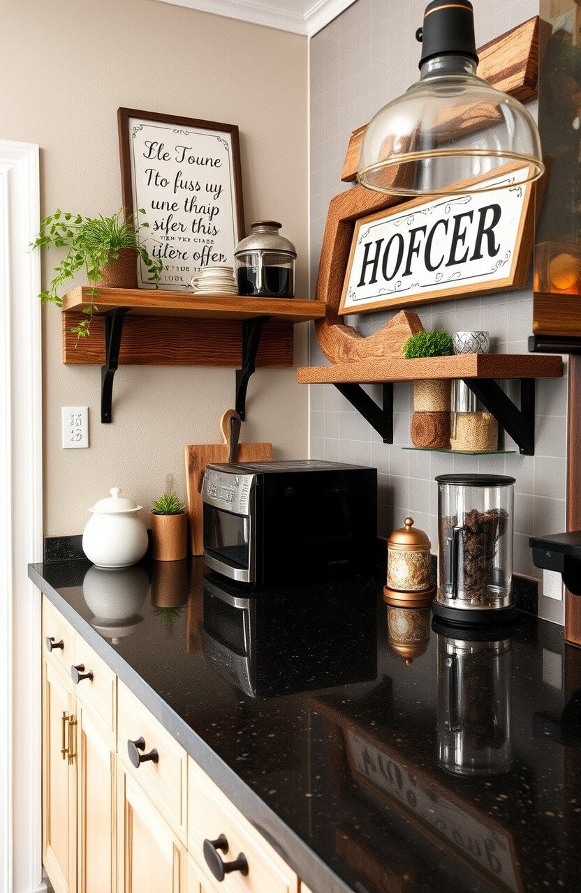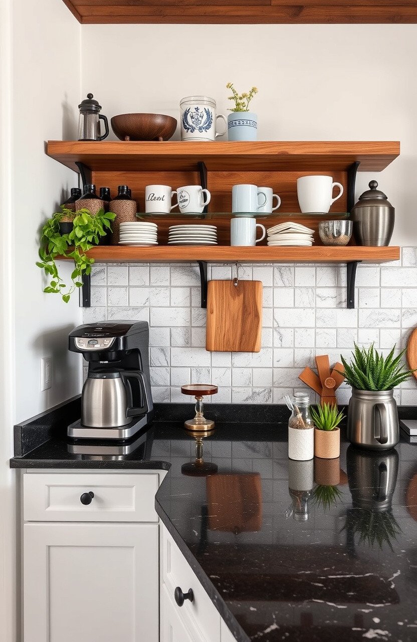 Wooden shelves add warmth to your coffee station. They contrast beautifully with black granite.