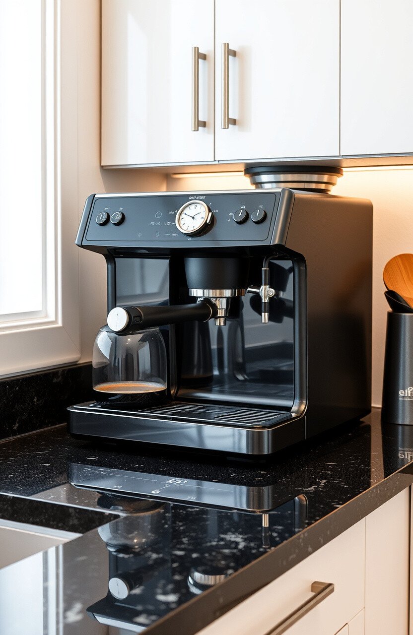 Modern coffee machines look stunning on black granite. They offer convenience and style.