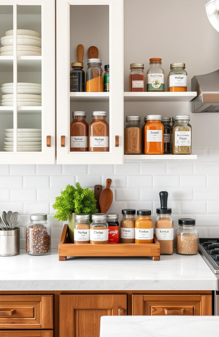 Organize your spices with a custom rack. It’s both practical and decorative.