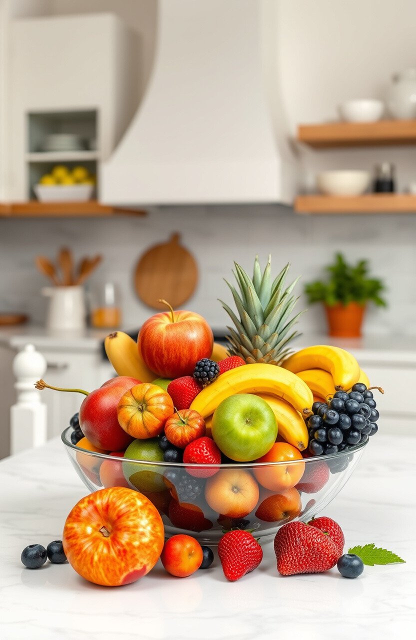 Add vibrancy with a bowl of colorful fruits. It’s a healthy and aesthetic addition.