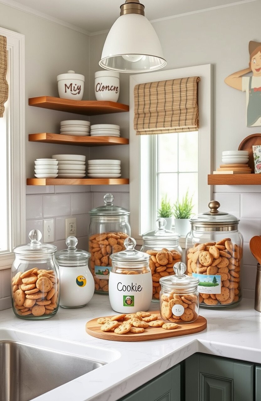 Add whimsy with themed cookie jars. They bring joy and sweetness to your kitchen.