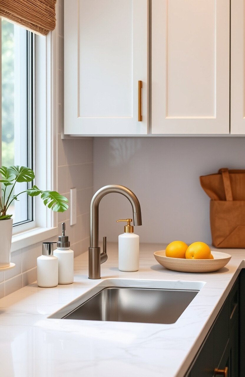 Add elegance with a designer dish soap dispenser. It’s a small but impactful detail.