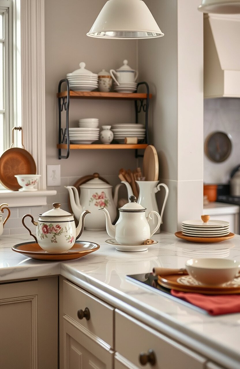 Bring out the vintage charm with a classic tea set. Place it strategically on the countertop.