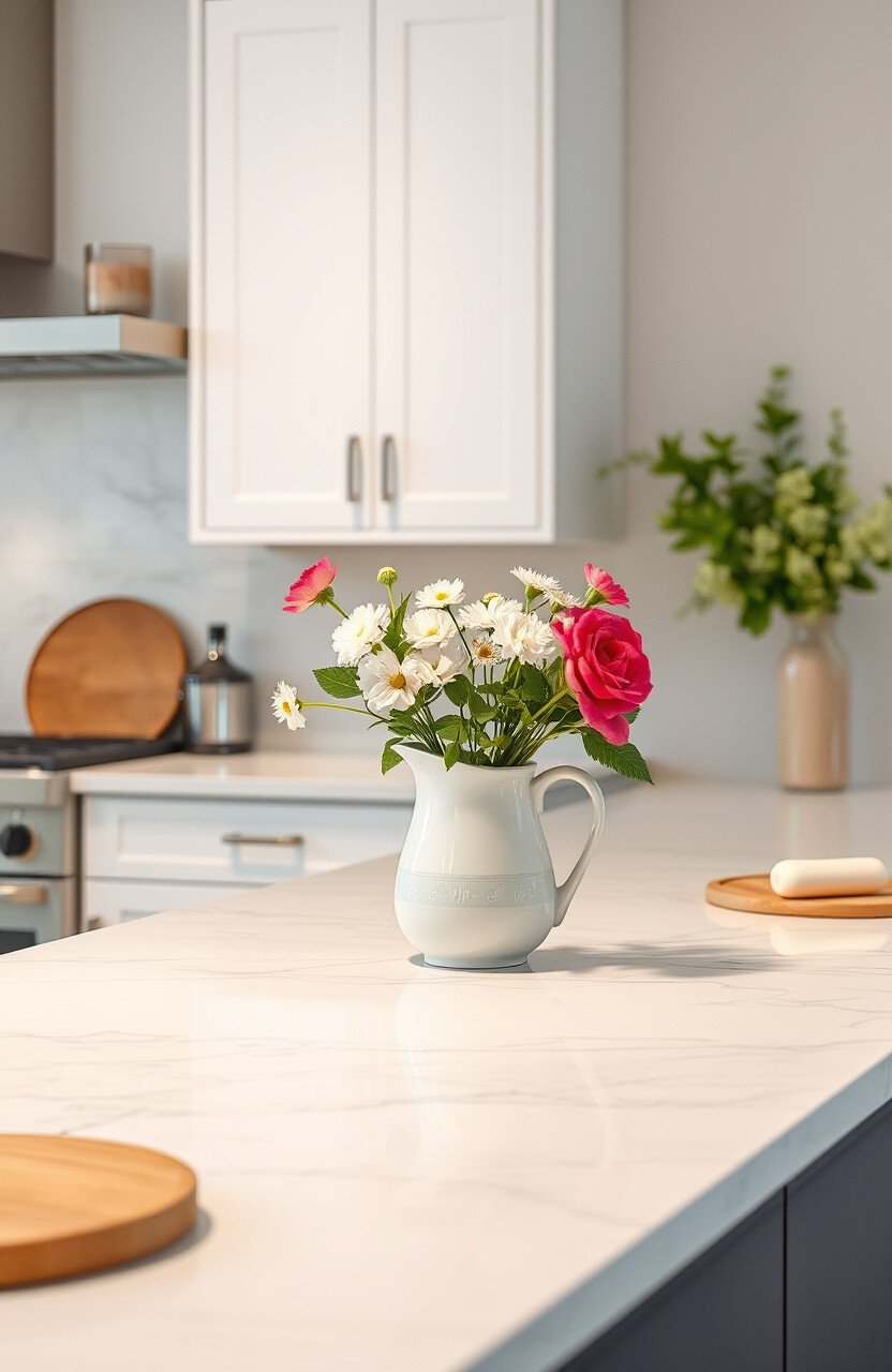 Brighten the space with a stunning floral arrangement. It adds color and life to your kitchen.