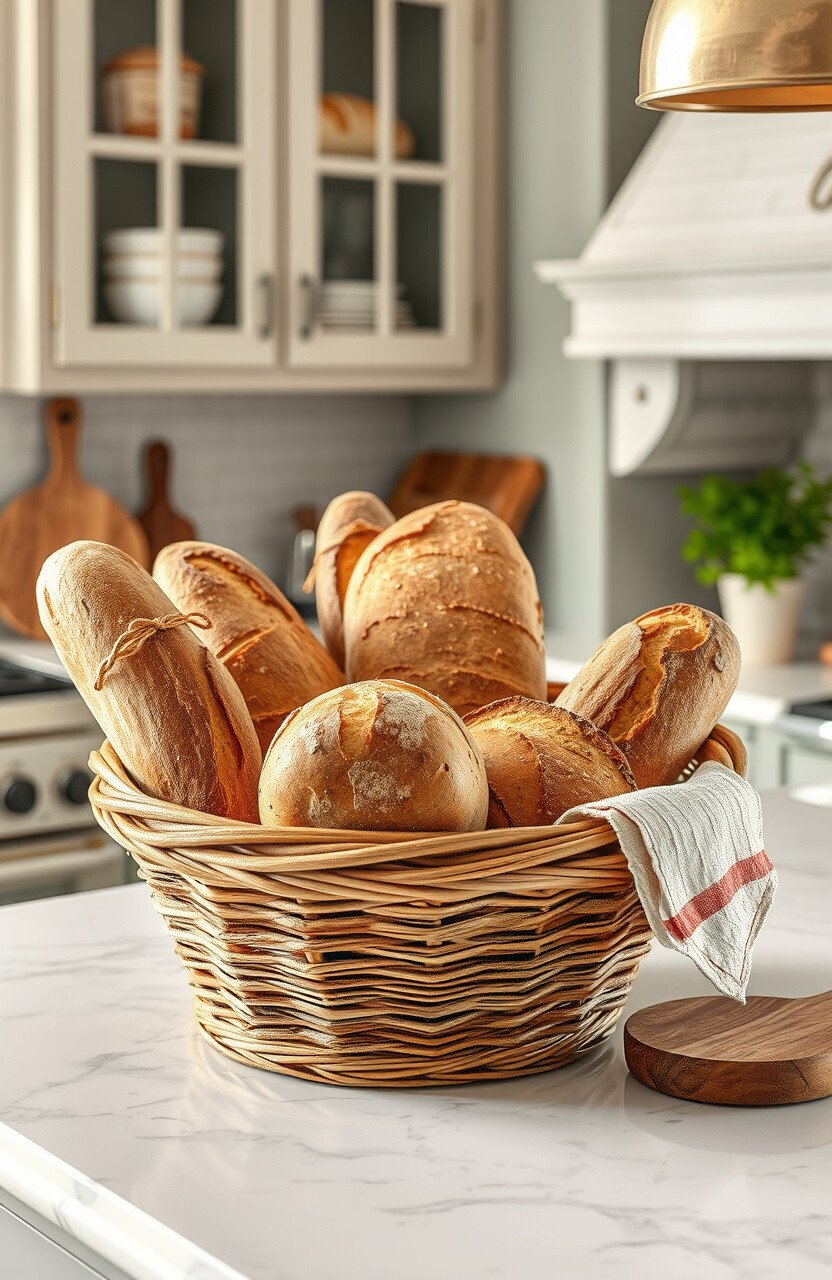 Showcase freshly baked bread in an artisanal basket. It’s both functional and decorative.